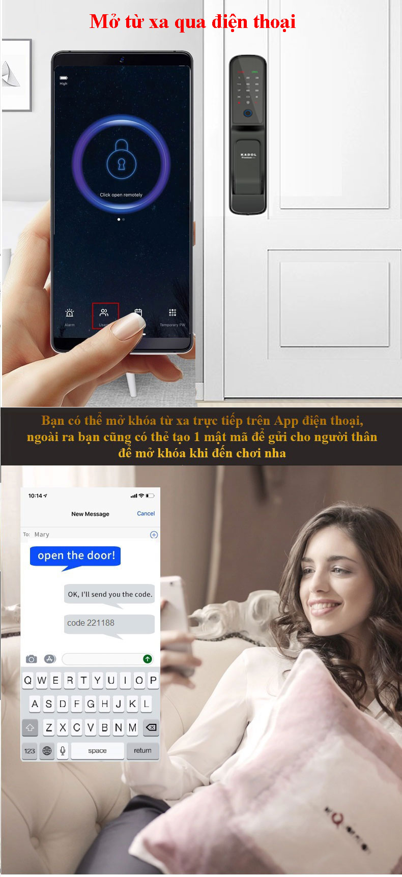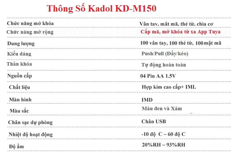 Mở khóa từ xa qua điện thoại: Kadol KD-M150 có thể năng cấp chức năng mở khóa từ xa qua điện thoại dù bạn ở bất kỳ nơi đâu. Kadol KD-M150 sử dụng app tuya rất phổ thông tại việt Nam. Nó cho phép bạn mở khóa từ xa, cấp mã từ xa