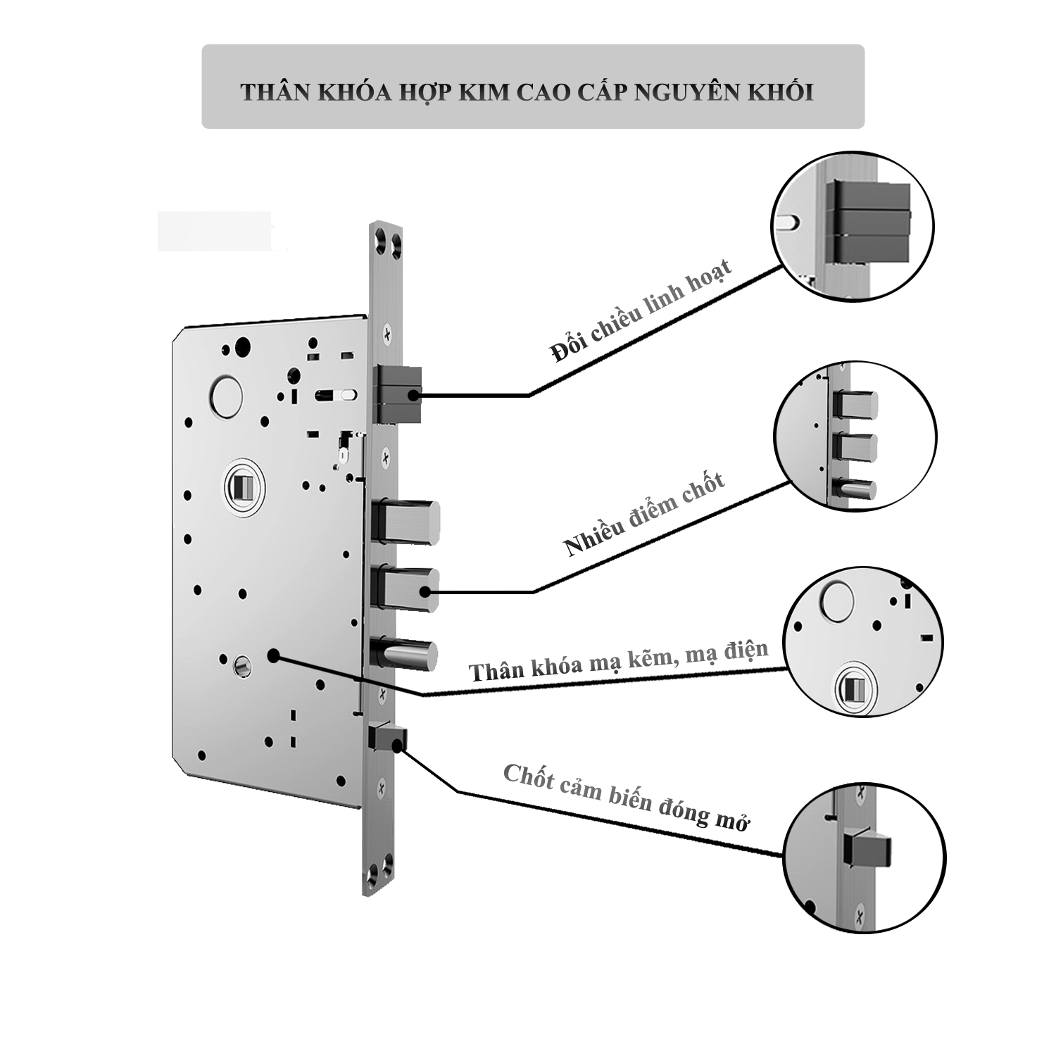 Khóa làm từ hợp kim kẽm dày, độ bền kéo là 280Mpa, độ bền uốn lên là 230Mpa.