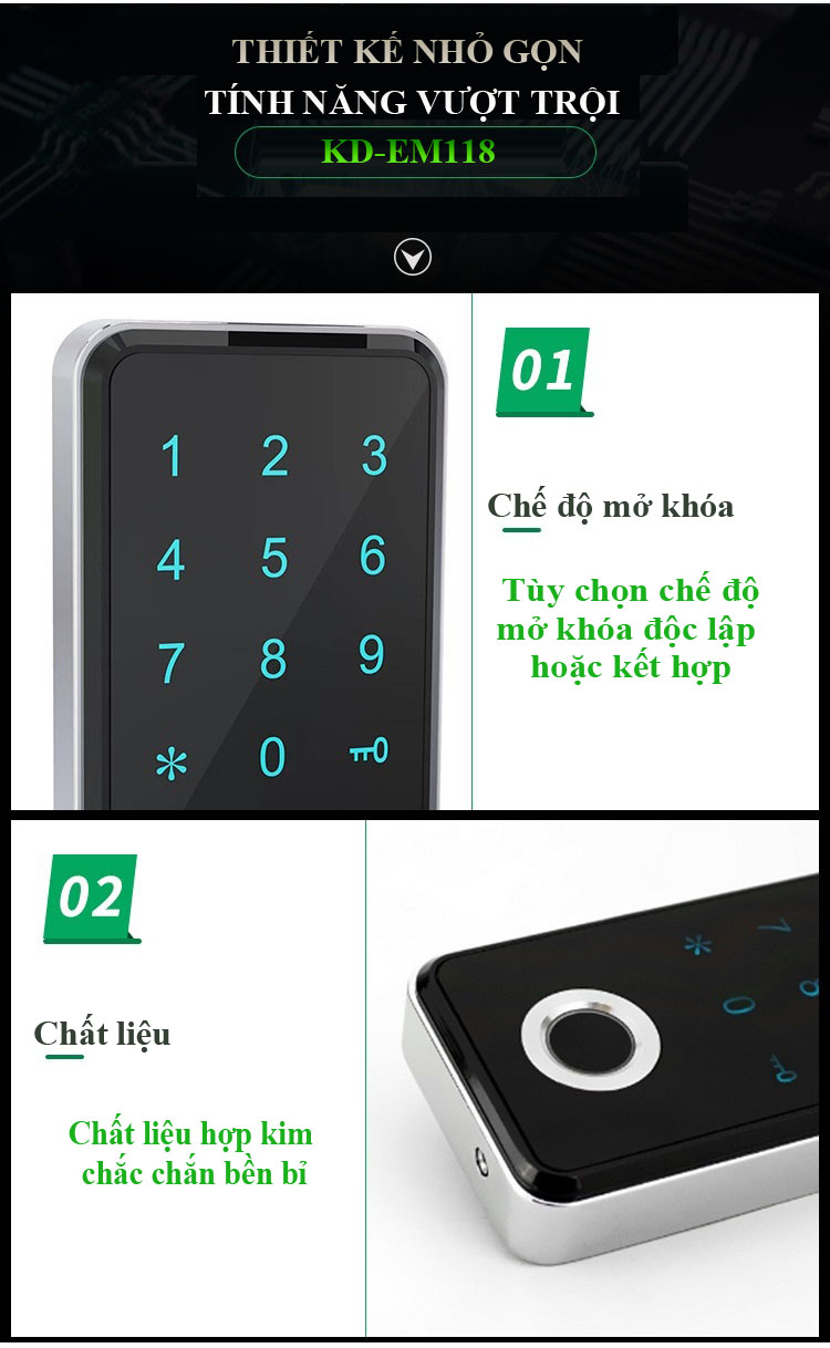 Kadol KD-EM118 mở khóa bằng vân tay, mã số, thẻ từ và Bluetooth app vô cùng tiện lợi cho việc sử dụng cũng như cài đặt