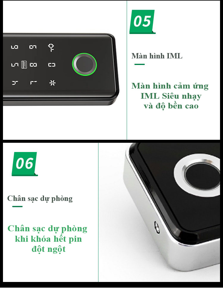 + Phương thức mở khóa : Sử dụng vân tay, thẻ từ, mã số và Bluetooth app.
