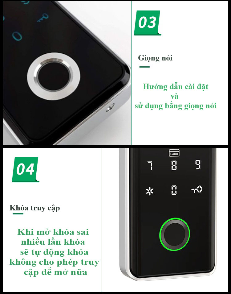 + Cảnh báo: Hệ thống báo khi pin sắp hết. Cảnh báo nếu có người cố tình mở cửa sau 1 số lần mở khóa không thành công.